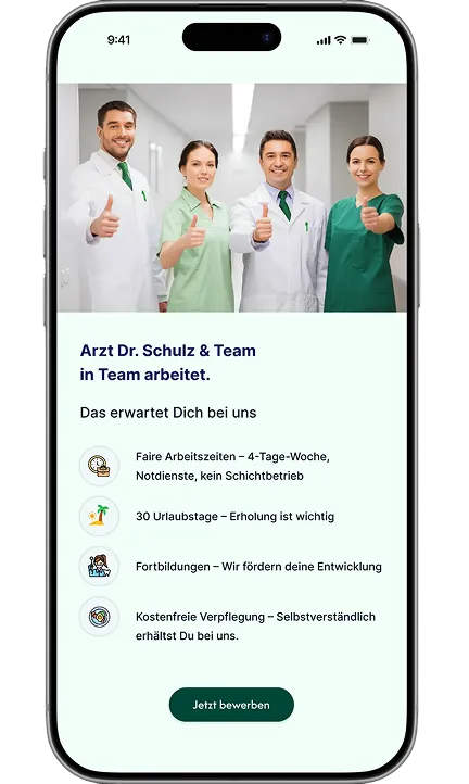 Wenn sich potentielle Mitarbeiter:innen über Ihre Praxis informieren, darf natürlich eine Karriere-Seite auf Ihrer Website nicht fehlen. Mit allen Details zur Stelle und den Vorzügen Sie als Arbeitgeber zu haben.